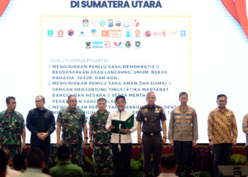 FOTO: Pj Gubernur Sumatera Utara (Sumut) Hassanudin bersama Forkopimda Sumut dan Bupati/Walikota se-Sumut menanda tangani Kesepakatan Pendanaan Bersama Pilkada Serentak...