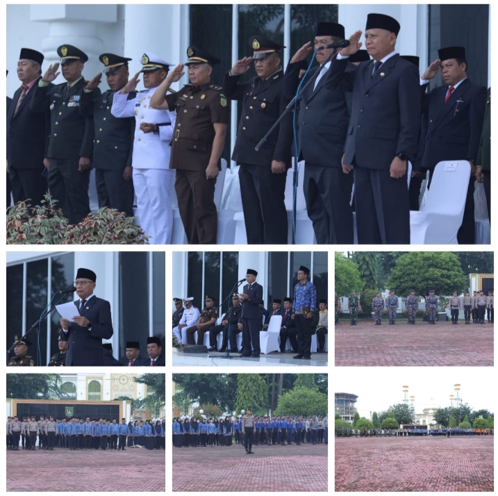 Asahan (Portibi DNP): Bupati Asahan H. Surya, B.Sc memimpin Upacara Hari Bela Negara ke-76 Tahun tingkat Kabupaten Asahan yang bertempat di Halaman Kantor Bupati Asahan, Kamis (19/12/2024). Turut hadir dalam acara tersebut Wakil Bupati Asahan, Danlanal TBA, Mewakili Kapolres Asahan, Mewakili Dandim 0208/AS, Mewakili Kajari Kajari Asahan, Mewakili PN Kisaran, Mewakili Danyon 126/KC, Sekretaris Daerah Kabupaten Asahan, Asisten, Staff Ahli, OPD, Sekretaris OPD, serta seluruh camat se-Kabupaten Asahan.