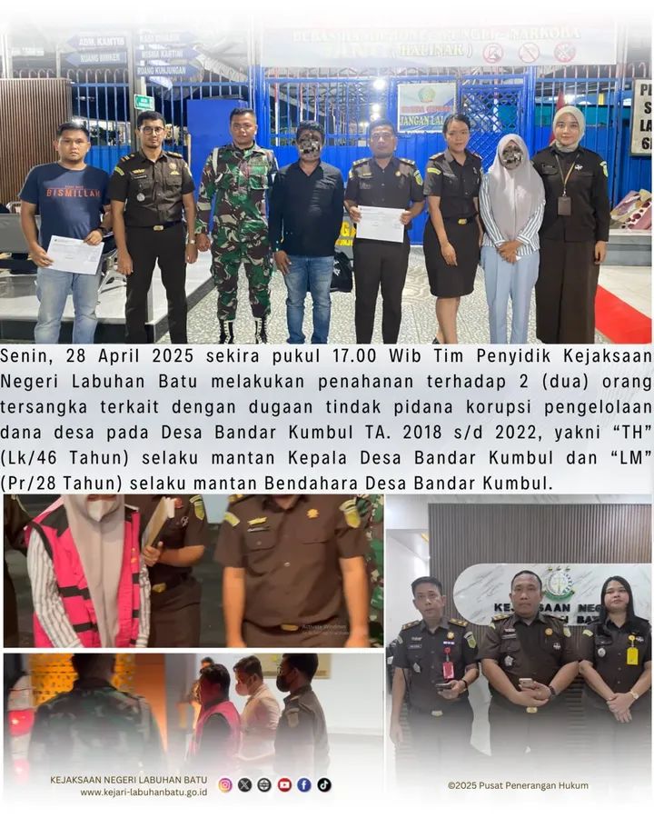 Labuhanbatu (Portibi DNP): Kejaksaan Negeri Labuhanbatu resmi menahan mantan Kepala Desa dan Bendahara Desa Bandar Kumbul Kecamatan Bilah Barat TH (46) dan LM (28) ditahan atas dugaan korupsi Dana Desa anggaran tahun 2018 hingga 2022 senilai 1,6 milyar rupiah, pada Senin malam (27/4/2025).