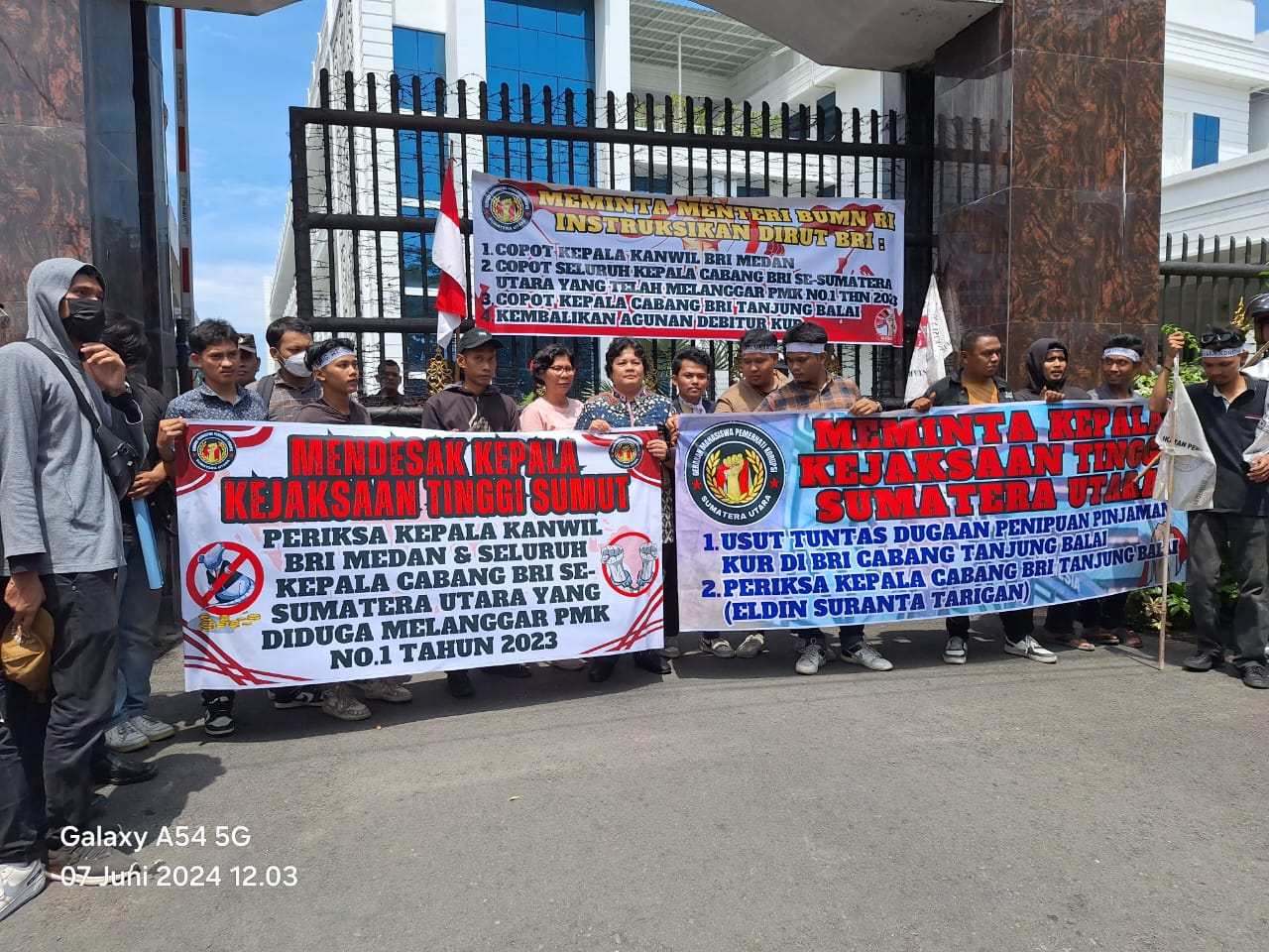 MEDAN (Portibi DNP): Ratusan massa Gerakan Mahasiswa Pemerhati Korupsi (GMPK) menggeruduk Kantor Wilayah (Kanwil) Bank Rakyat Indonesia (BRI) Medan, Jumat, 7 Juni 2024. Massa yang merupakan gabungan dari 7 organisasi mahasiswa itu, melakukan unjukrasa dan berorasi di pintu masuk kantor wilayah yang berada di Jl. MT. Haryono, Kota Medan itu.