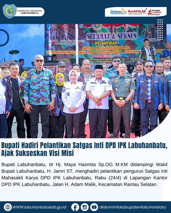 Bupati mengucapkan selamat dan sukses kepada pengurus Satgas Inti Mahasakti Karya DPD IPK yang baru saja dilantik. Bupati mengajak untuk secara bersama-sama mensukseskan visi misi dalam membangun Labuhanbatu tanpa adanya perpecahan.