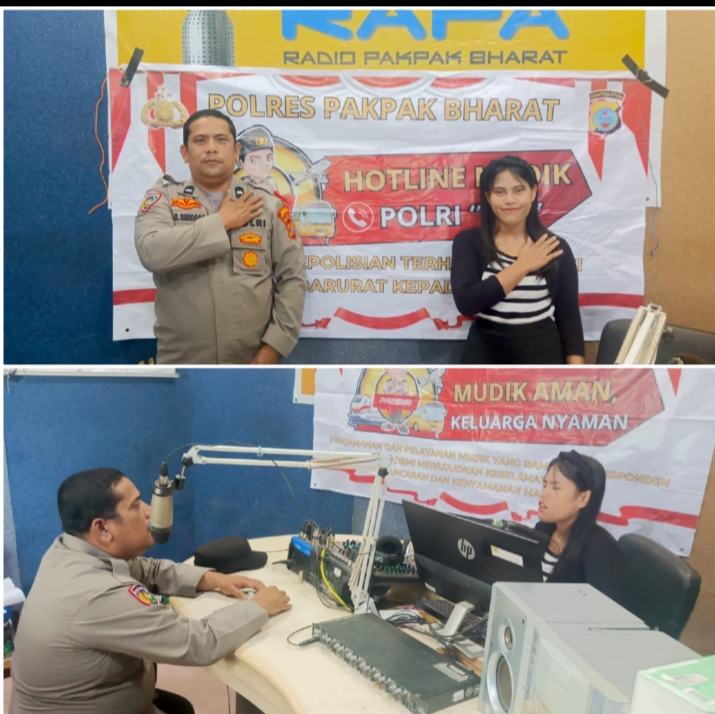 PAKPAK BHARAT(Portibi DNP): Untuk memaksimalkan pelayanan kepada masyarakat menjelang mudik lebaran 1446 H/2025 Polres Pakpak Bharat melalui Sat Binmas melaksanakan sosialisasi Mudik Aman keluarga Nyaman dan Tagline 110 kepada masyarakat melalui Gelombang Radio Rapa di frekuensi : 90,20 FM, Sabtu(22/3) lokasi studio Rapa FM Panorama Indah Sindeka Kabupaten Pakpak Bharat.