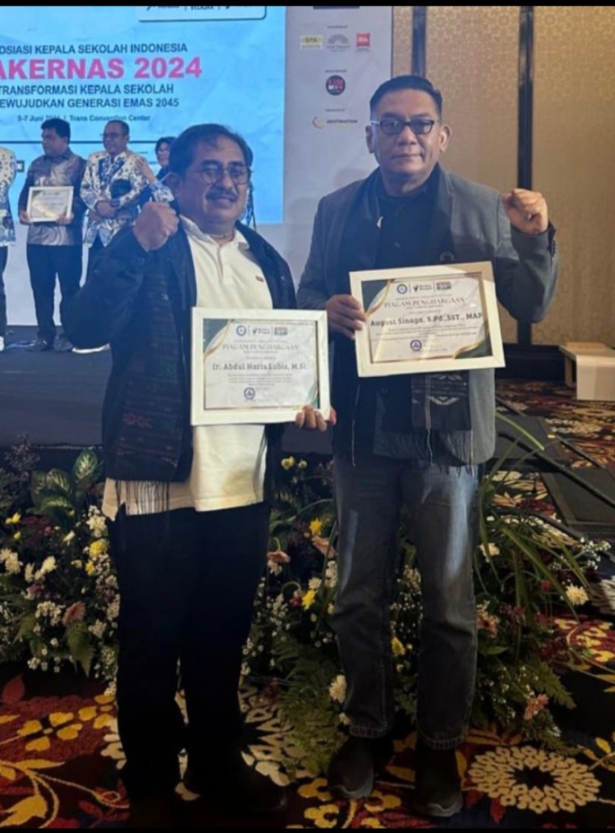 Teks Foto : Ir. Abdul Haris Lubis, Kepala Dinas Pendidikan Provinsi Sumatera Utara, menerima penghargaan sebagai Tokoh Inspiratif Implementasi Kurikulum Merdeka dan August Sinaga SPd, S.ST, MAP Kepala Cabang Dinas Pendidikan Wilayah I Provinsi Sumatera Utara diberikan penghargaan sebagai Tokoh Inspiratif Penggerak Kemah Profil Pelajar.