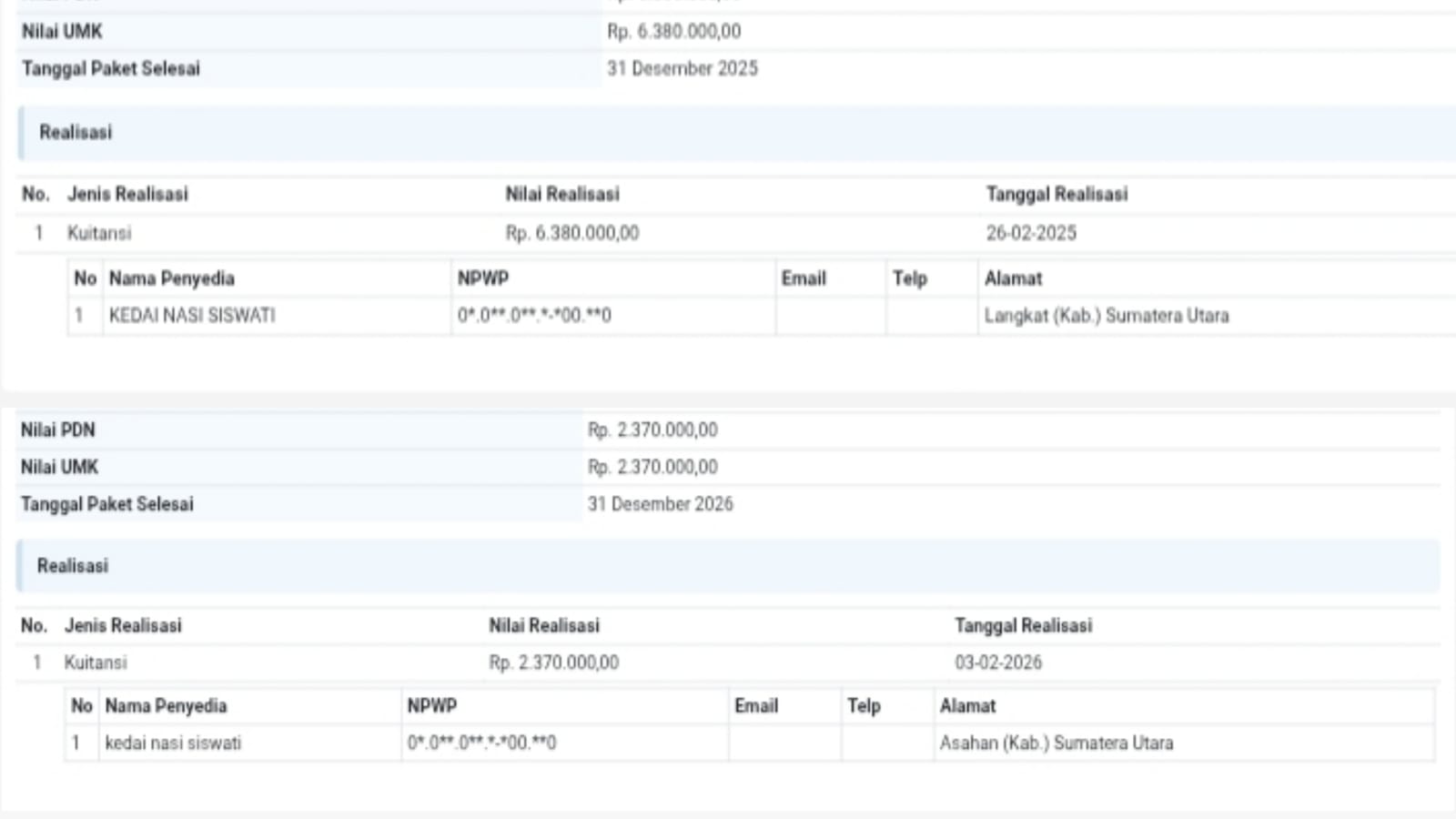 Pekerjaan itu pun dimenangkan oleh kedai nasi Siswati, beralamat di Langkat, Sumatera Utara, dengan nilai realisasi sebesar Rp6.380.000.