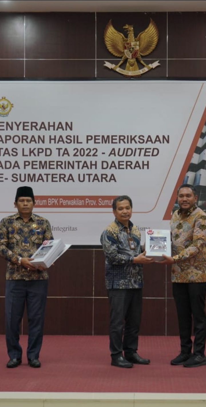 PAKPAK BHARAT(PortibiDNP): Dalam rangka memenuhi amanat Undang-Undang Nomor 15 Tahun 2004 tentang Pemeriksaan Pengelolaan dan Tanggung Jawab Keuangan Negara, BPK Perwakilan Provinsi Sumatera Utara menyerahkan Laporan Hasil Pemeriksaan (LHP) atas Laporan Keuangan Pemerintah Kabupaten Pakpak Bharat, di Gedung Auditorium kantor BPK Perwakilan Provinsi Sumatera Utara,Medan, Jumat (12/05/2023).