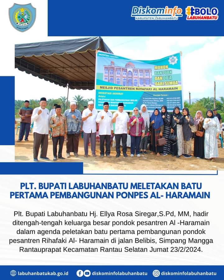 Labuhanbatu ( Portibi DNP): Plt. Bupati Labuhanbatu Hj. Ellya Rosa Siregar,S.Pd, MM, hadir ditengah-tengah keluarga besar pondok pesantren Al -Haramain dalam agenda peletakan batu pertama pembangunan pondok pesantren Rihafaki Al- Haramain di jalan Belibis, Simpang Mangga Rantauprapat Kecamatan Rantau Selatan ,Jumat (23/2/2024)