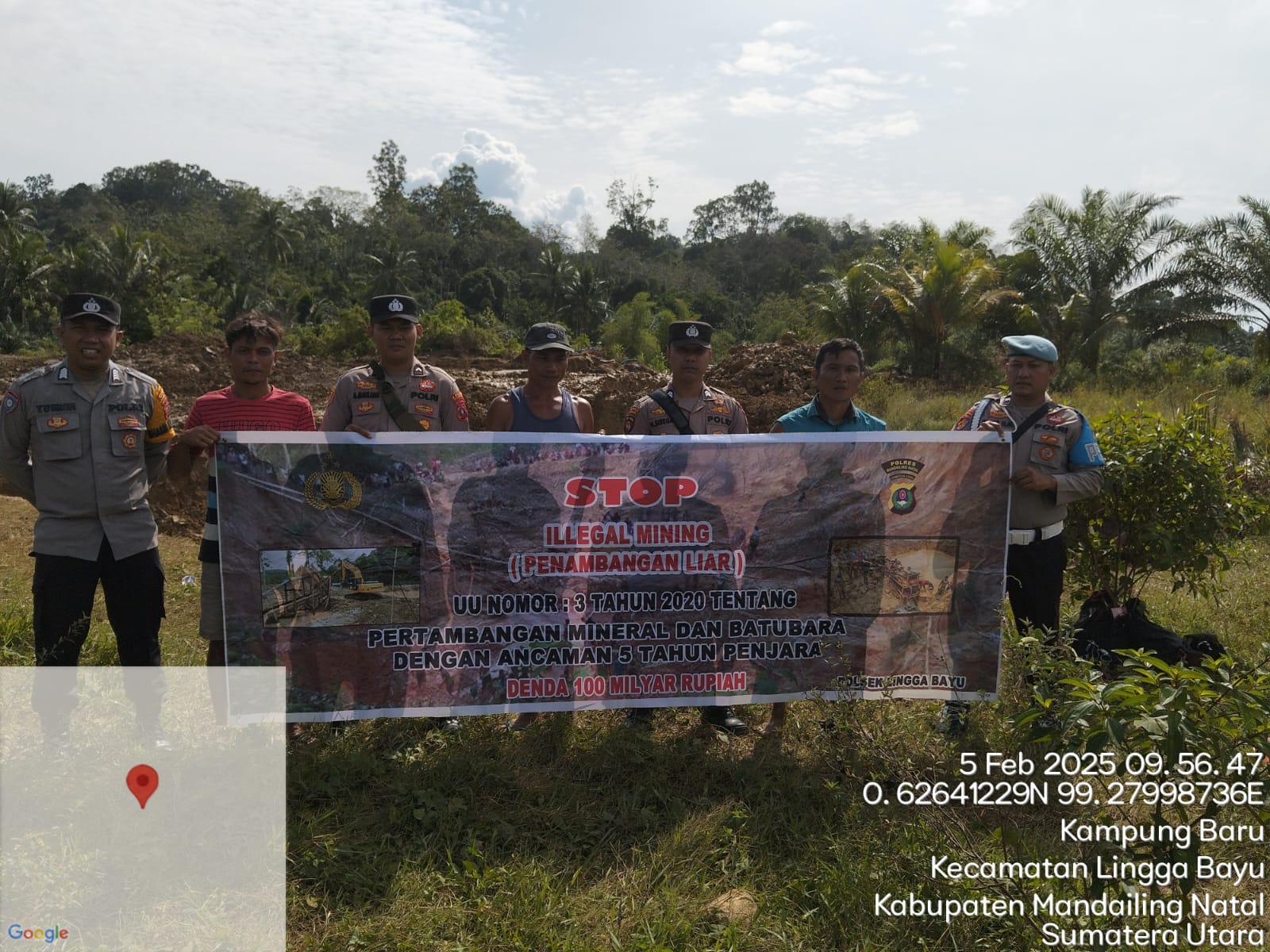 MADINA(Portibi DNP): Kapolsek Lingga Bayu, Akp. Marlon Raja Gukguk dalam keterang annya ke Portibi Dnp di kantor Pol sek Lingga Bayu Kelurahan Simp. Gambir, pada Rabu 5/2/2025, me mengatakan bahwa, pada hari ini Kapolsek Lingga Bayu beserta Personilnya mendatangi lokasi PETI atau yg di katakan tambang emas ilegal di Desa Lobung Kecamatan Lingga Bayu Kab. Mandailing Na tal yang disinyalir sebagai pemiliknya adalah JH alias KL, dilokasi tersebut Kapolsek Akp. Marlon Raja Gukguk dan Personil menghimbau dan melarang kepada seluruh pekerja yang notabene masarakat setempat untuk tidak melakukan penambangan emas tanpa izin dari Instansi terkait di Pemerintahan ini, walaupun dgn memakai mesin dompeng, izinnyapun harus ada.