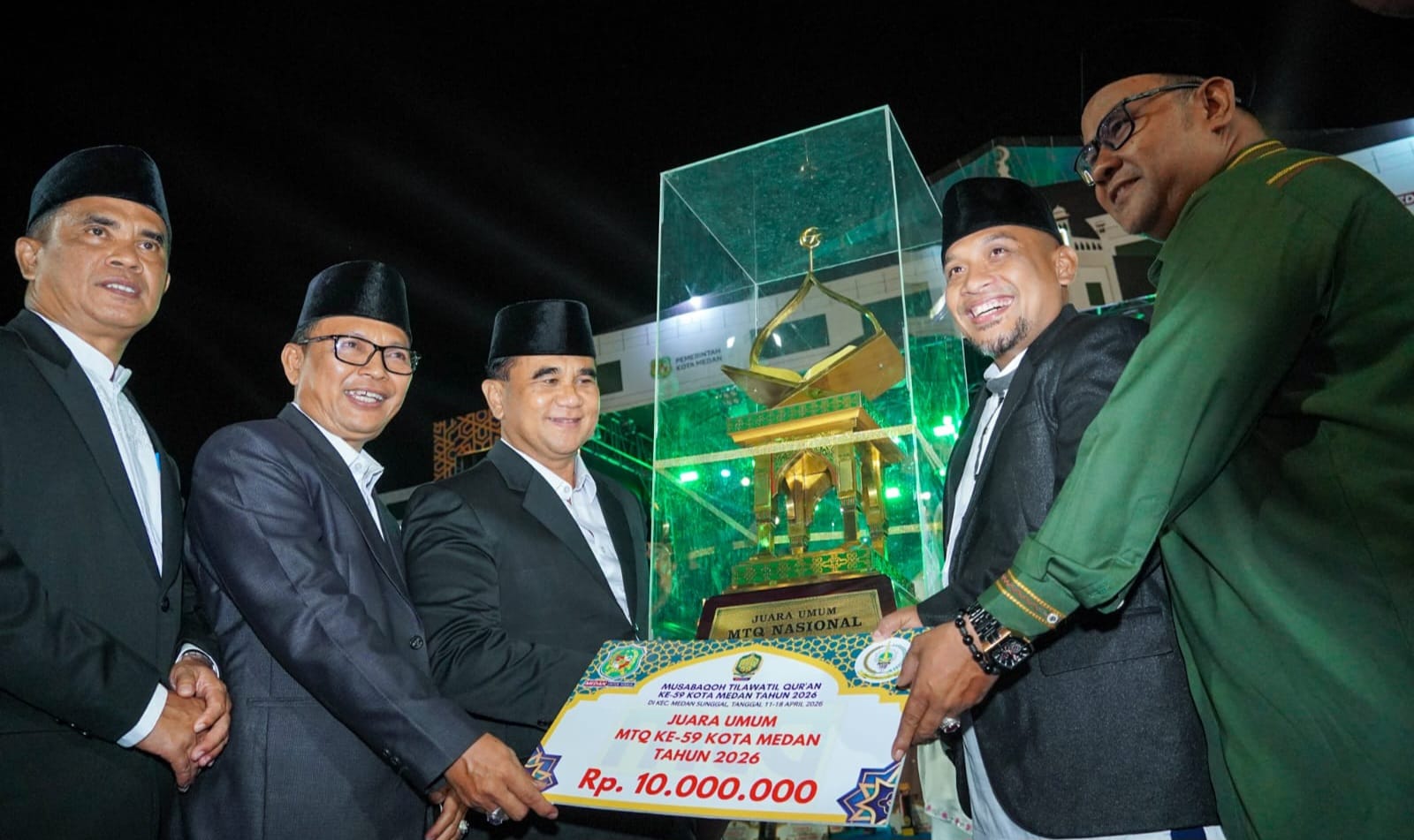 Piala bergilir MTQ Kota Medan diserahkan Wali Kota Medan, Rico Tri Putra Bayu Waas diwakili Asisten Pemerintahan dan Kesejahteraan Rakyat Setda Kota Medan, M. Sofyan kepada Camat Medan Selayang, Muhammad Husnul Hafis sekaligus menjadi penanda berakhirnya perhelatan MTQ ke-59 tingkat Kota Medan yang telah berlangsung dari tanggal 11-18 April 2026 di Jalan Gatot Subroto, Sabtu (18/4/2026) malam.