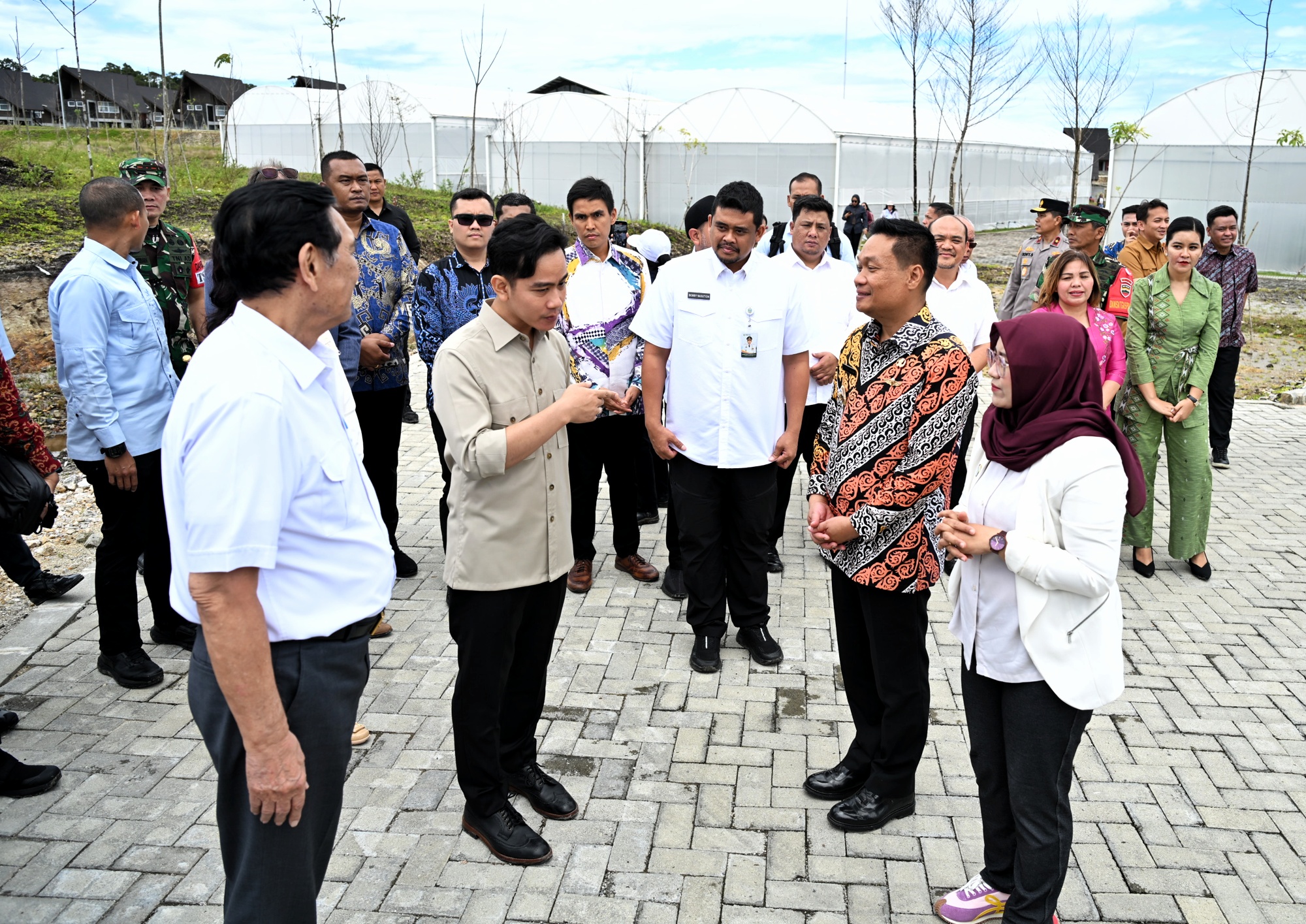 FOTO: Gubernur Sumatera Utara (Sumut) Muhammad Bobby Nasution dan Ketua TP PKK Sumut Kahiyang Ayu mendampingi Wakil Presiden (Wapres) Republik Indonesia Gibran Rakabuming serta istri Selvi Gibran Rakabuming meninjau Taman Sains Teknologi Herbal dan Hortikultura (TSTH2) di Kecamatan Pollung, Kabupaten Humbang Hasundutan, Jumat (16/05/2025).