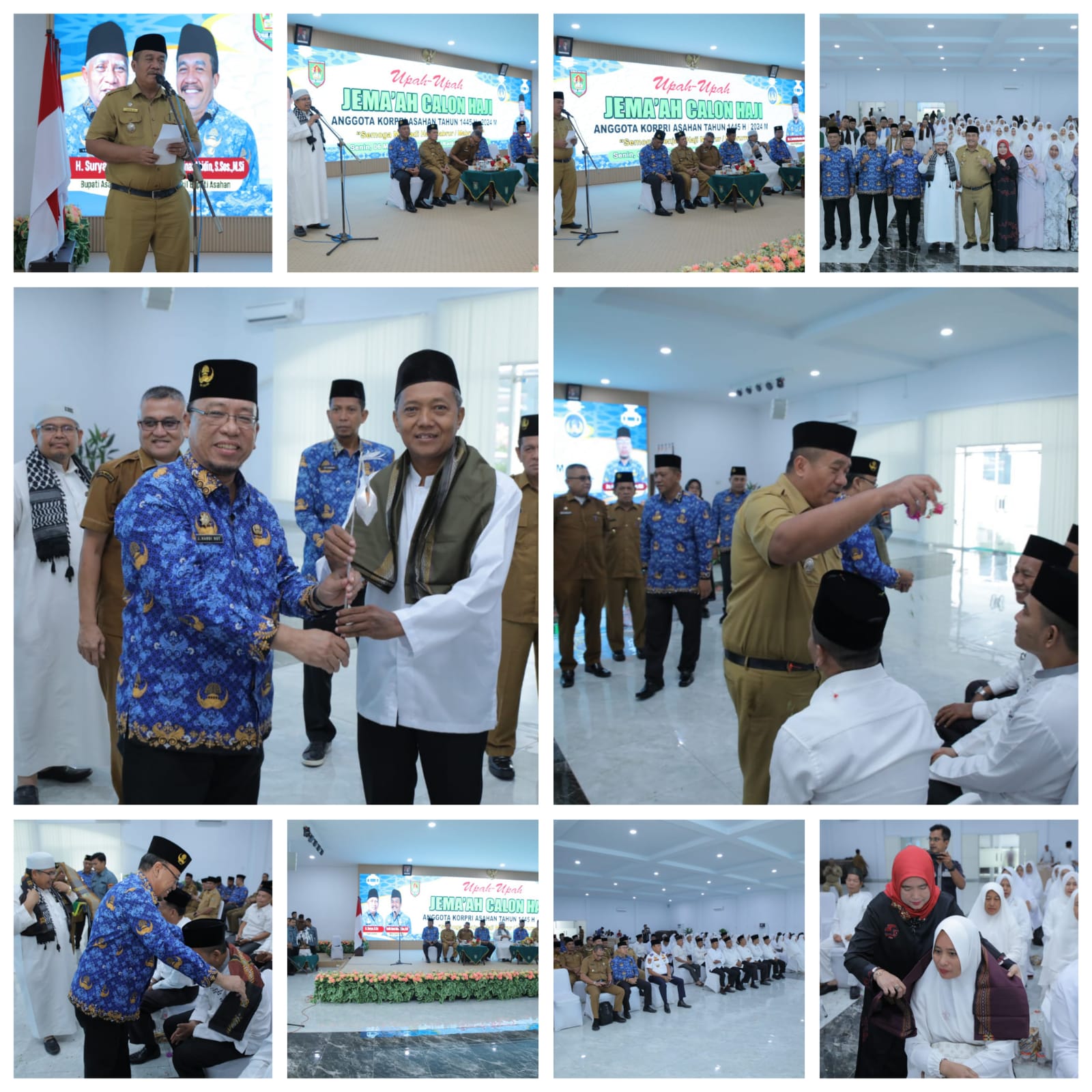 Asahan (Portibi DNP):Wakil Bupati Asahan Taufik Zainal Abidin, S. Sos, M. Si Upah-upah 64 orang Jama’ah Calon Haji Anggota Korpri Asahan Tahun 1445 H/2024 M yang terdiri dari 21 Laki-laki dan 43 Perempuan bertempat di Aula Melati Kantor Bupati Asahan, Senin (06/05/2024) Pagi Tadi.