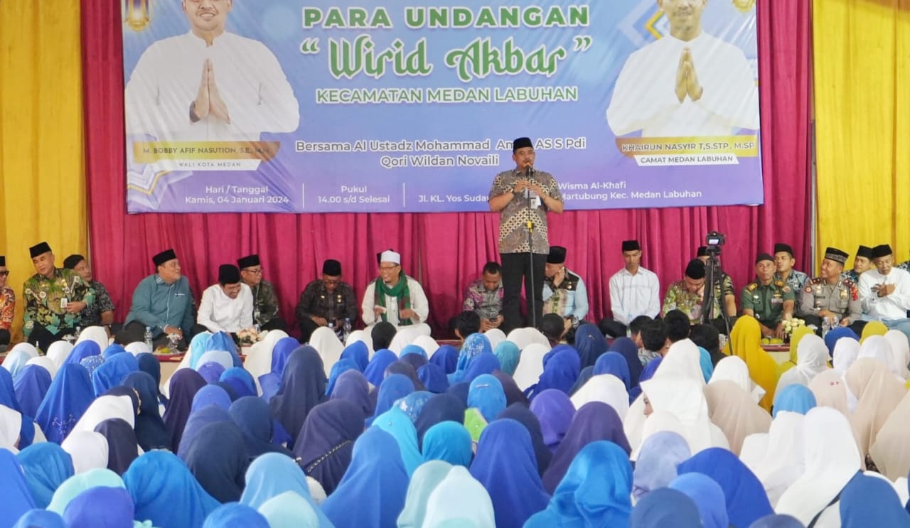 “Mudah-mudahan seluruh pekerjaan yang ada di Kecamatan Medan Labuhan ini akan kami selesaikan di tahun ini,”kata, Bobby saat menghadiri Wirid Akbar se-Kecamatan Medan Labuhan di Wisma Al-Kahfi, jalan Yos Sudarso, Kamis (4/1/2024).