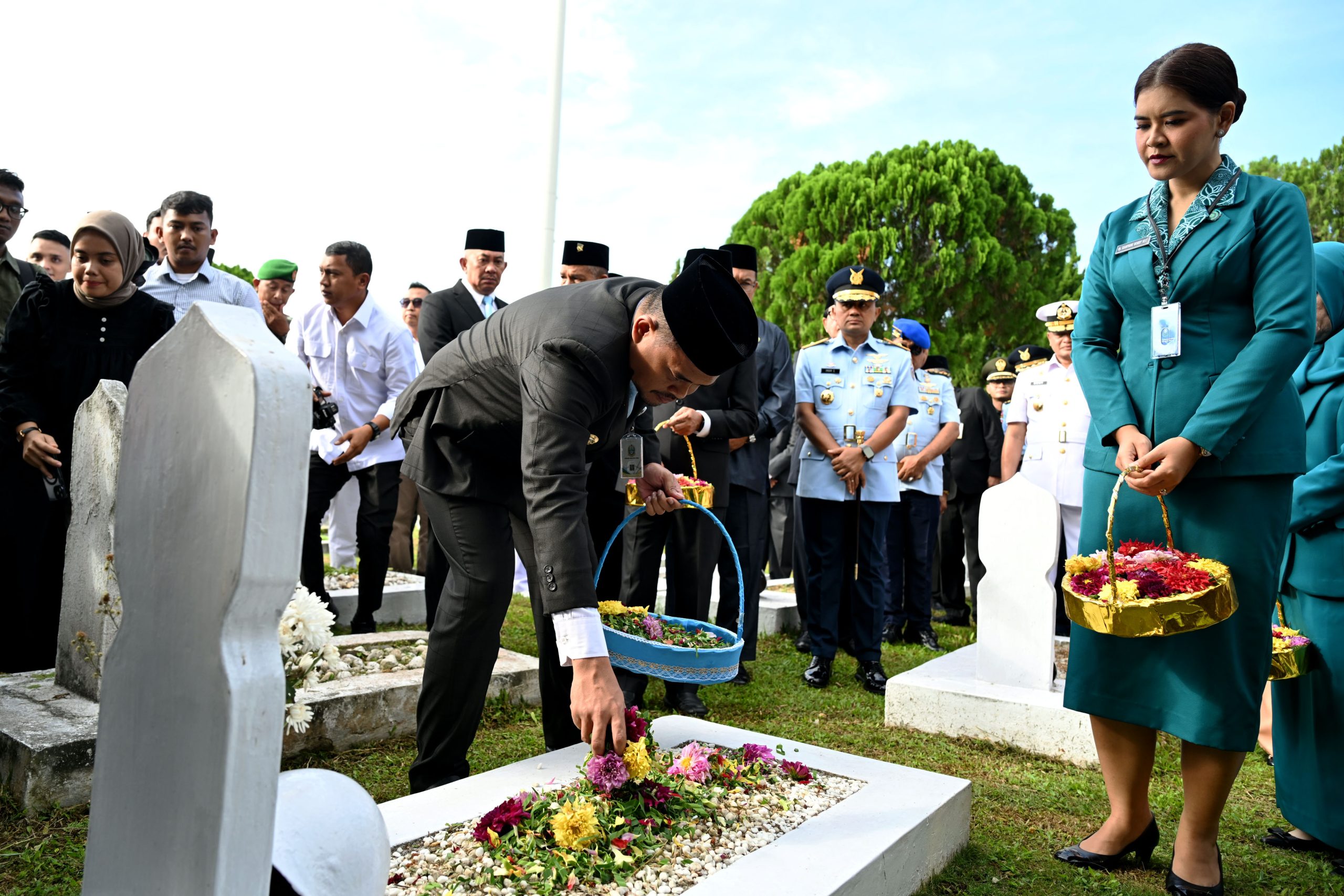 Didampingi Ketua TP PKK Sumut Kahiyang Ayu, Bobby Nasution menaburkan bunga sebagai bentuk penghormatan, yang kemudian diikuti rombongan Forum Koordinasi Pimpinan Daerah (Forkopimda).